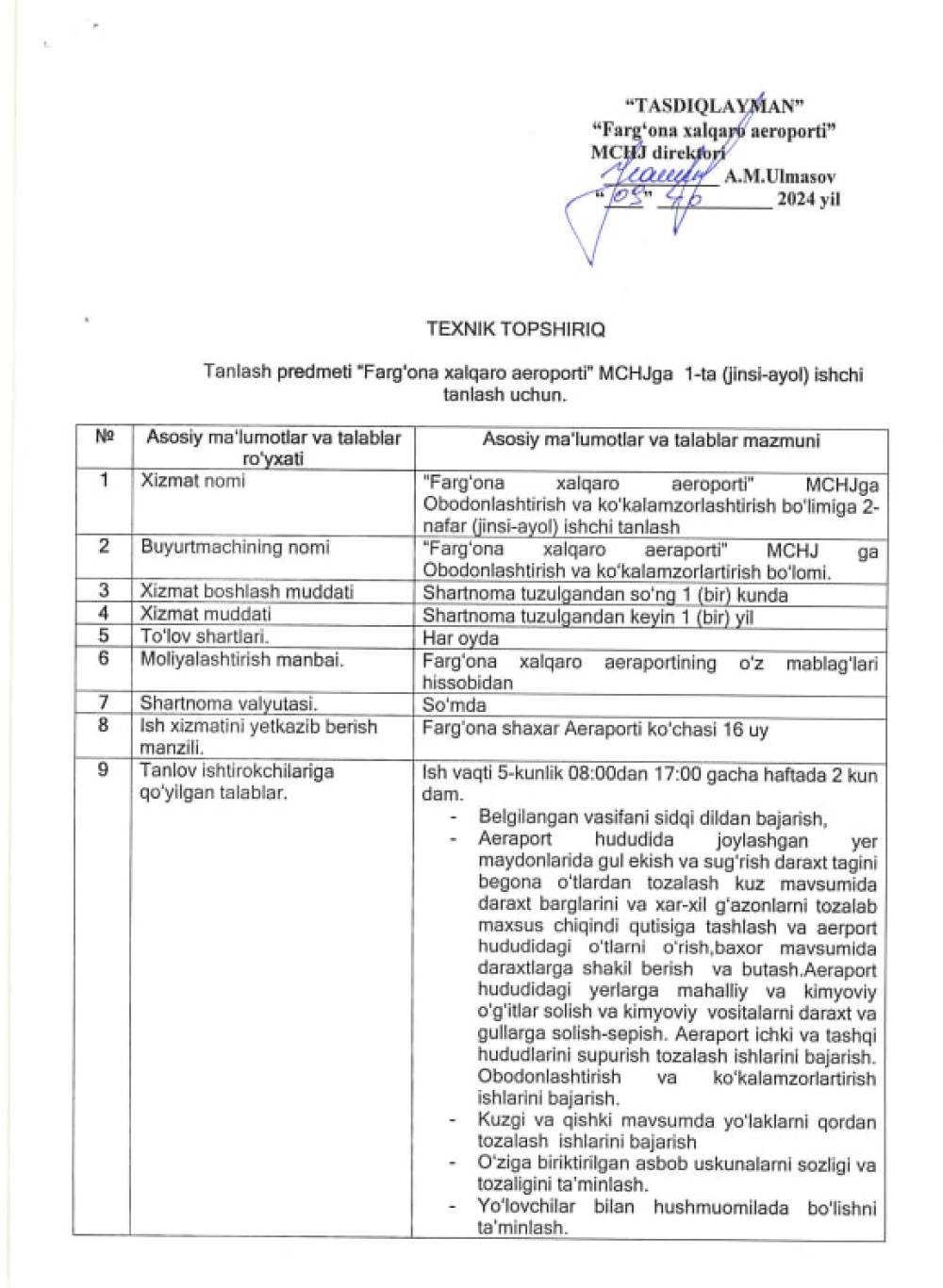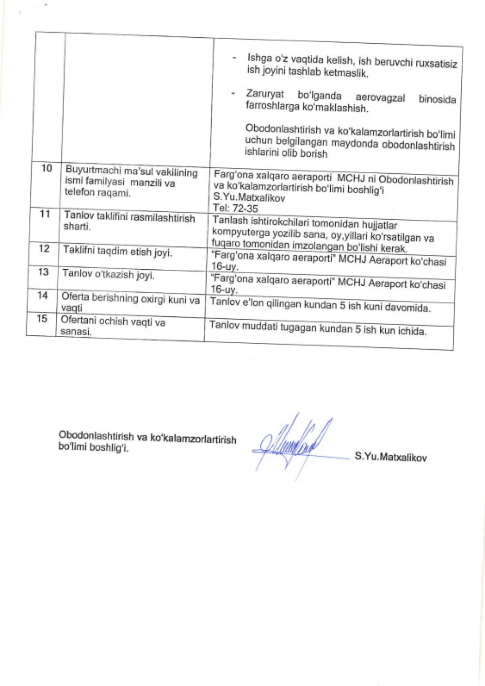 "Farg'ona xalqaro aeroport" MCHJ ga obodonlashtirish bo'limiga 1- ta (jinsi-ayol) (ishchi ) xizmatining narxi bo'yicha barcha qiziquvchilar ma'lumot sifatida o'z takliflarini taqdim etishlari mumkin. Ushbu berilgan takliflar bugungi kunda bu xizmatni belgilangan tartibda davlat xaridlari to'g'risidagi qonunga muvofiq birja savdolari orqali e'lon berilib tanlov o'tkazilishida uning boshlang'ich narxini aniqlashda foydalaniladi va ma'lumot berish muddati 14.10.2024yil gacha