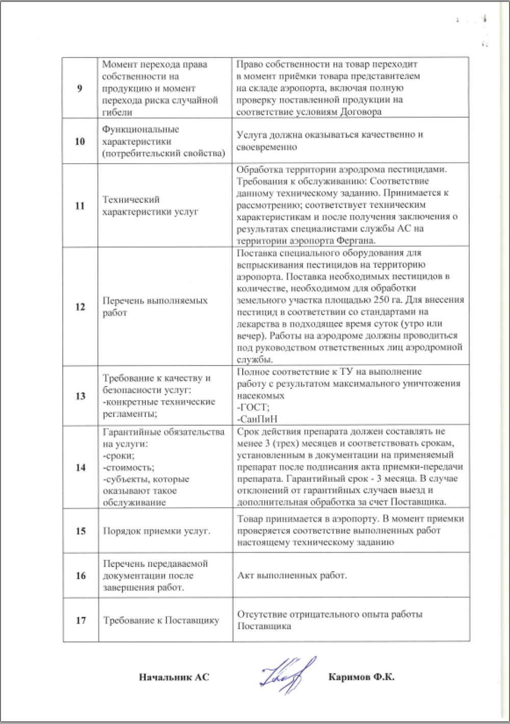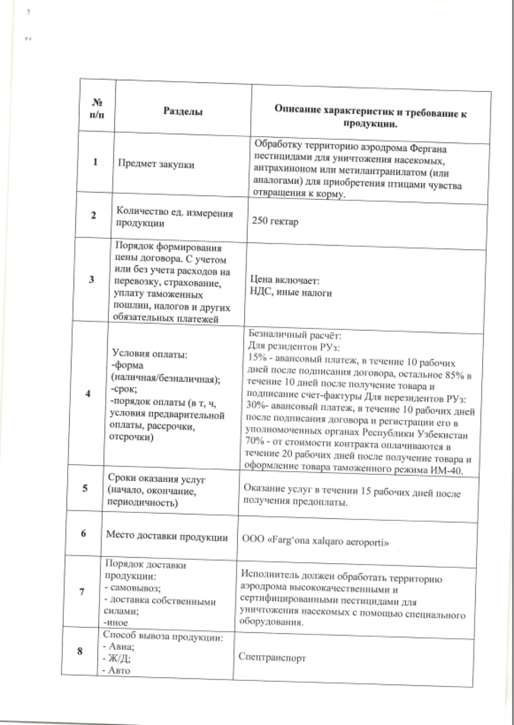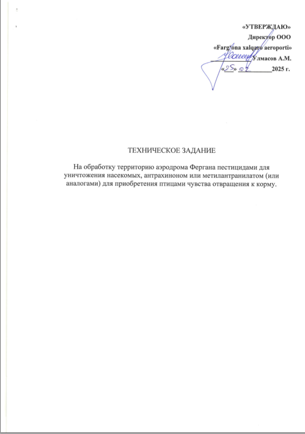 «Farg‘ona xalqaro aeroporti» MCHJ “ aerodromi hududini antrakinon yoki metilantranilat bilan hasharotlarni o‘ldirish uchun pestitsidlar bilan ishlov berish