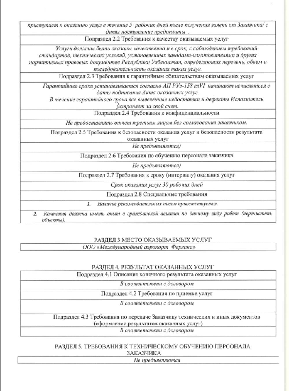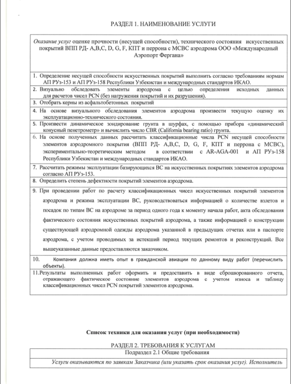 “Farg‘ona xalqaro aeroporti” MChJ aerodromining sun’iy yuzalarining texnik holati mustahkamligini baholash xizmatini ko‘rsatish faoliyati bilan shug‘ullanuvchi barcha yetkazib beruvchilar o‘z takliflarini “Farg‘ona xalqaro aeroporti” MCHJ ma‘muriyatiga taqdim etishlari mumkin. Taqdim etilgan takliflar ushbu xizmatni xarid qilib olishda uning boshlang‘ich narxini aniqlashda foydalaniladi. Texnik topshiriq 4 varaqda ilova qilinadi. Murojat uchun manzil Farg‘ona shahar Aeroport ko‘cha 16 uy. Elekton manzil: info.feg@uzairports.com Mas’ul shaxs Oripov D.A. tel: 73 241 60 03. 99 727 11 68. Aerodrom xizmari boshlig‘i Karimov F.K tel 90 290 98 85
