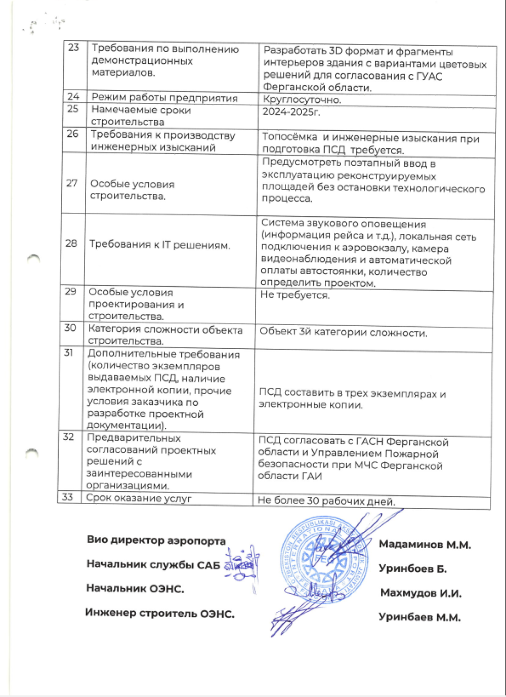 "Farg‘ona xalqaro aeroporti" MCHJ “Avtotransport vositalarining kirish va chiqish yo'llari va kelayotgan va ketayotgan yo'lovchilarni nazorat qilish uchun binolar qurish” ob’ektining loyiha-smeta hujjatini tayorlash xizmatini ko‘rsatish bilan shug‘ullanuvchi barcha yetkazib beruvchilar o‘z takliflarini "Farg‘ona xalqaro aeroporti” MCHJ ma‘muriyatiga taqdim etishlari mumkin. Taqdim etilgan takliflar ushbu xizmatni xarid qilib olishda uning boshlang‘ich narxini aniqlashda foydalaniladi. Texnik topshiriq 5 varaqda ilova qilinadi. Murojat uchun manzil Farg‘ona shahar Aeroport ko‘cha 16 uy. Elekton manzil: info.feg@uzairports.com Mas’ul shaxs OENS xizmati boshlig‘i Maxmudov I.I. tel: 73 241 60 03. 97 214 89 81. Qurilish muhandisi Urinboev M.M. tel 90 839 49 09