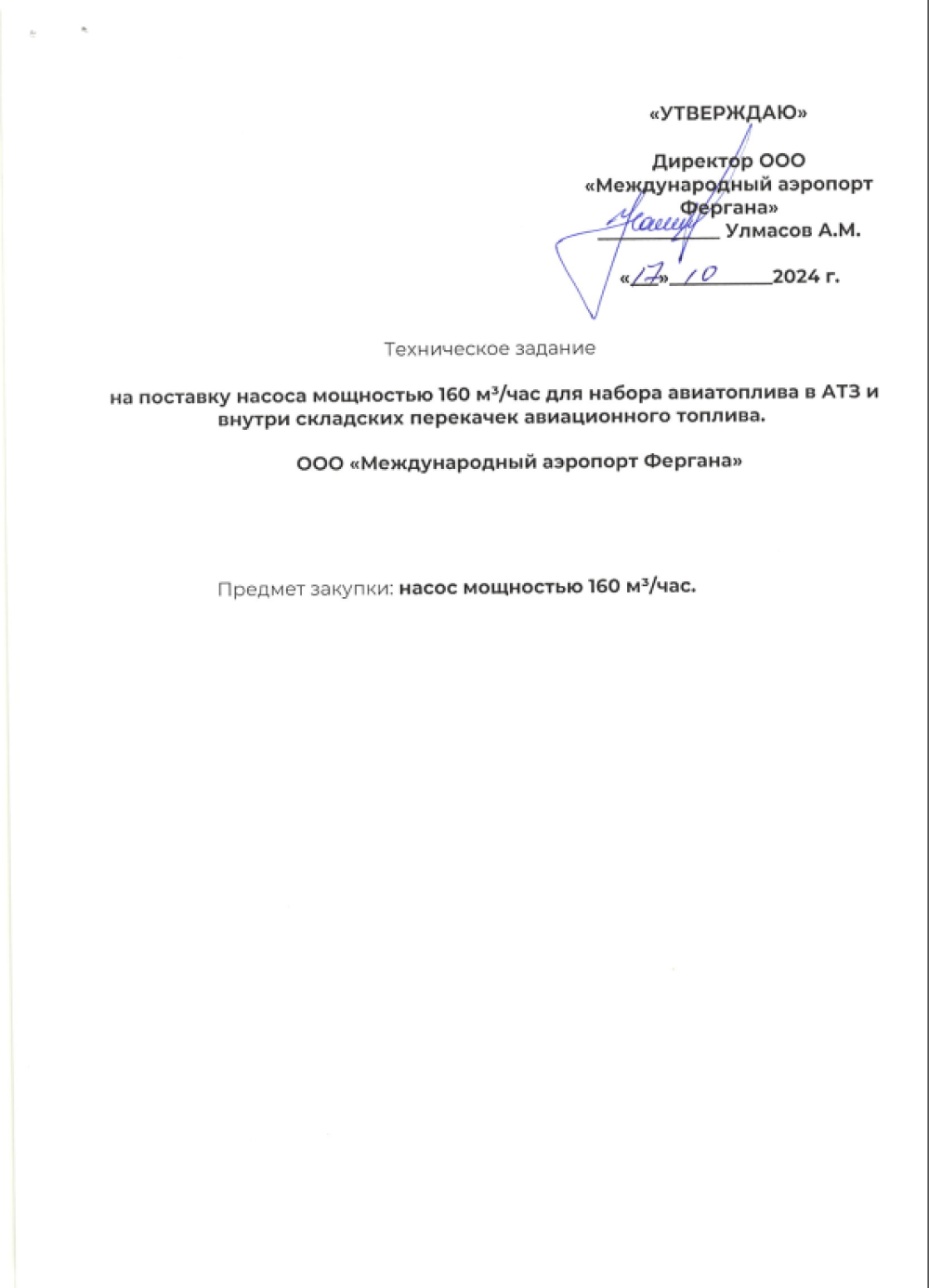 «Farg‘ona xalqaro aeroporti» MCHJ ehtiyoji uchun 2 dona aviayoqilg‘i maxsulotlarini xaydash uchun mo‘ljallangan nasos uskunasini yetkazib berish faoliyati bilan shug‘ullanuvchi barcha yetkazib beruvchilar o‘z takliflarini "Farg‘ona xalqaro aeroporti” MCHJ ma‘muriyatiga taqdim etishlari mumkin. Taqdim etilgan takliflar ushbu nasos uskunasini xarid qilib olishda uning boshlang‘ich narxini aniqlashda foydalaniladi. texnik topshiriq 4 varaqda ilova qilinadi. Murojat uchun manzil Farg‘ona shahar Aeroport ko‘cha 16 uy. Elekton manzil: info.feg@uzairports.com Mas’ul shaxs Xaydarov Z.T. tel: 73 241 60 03. 90 531 77 25