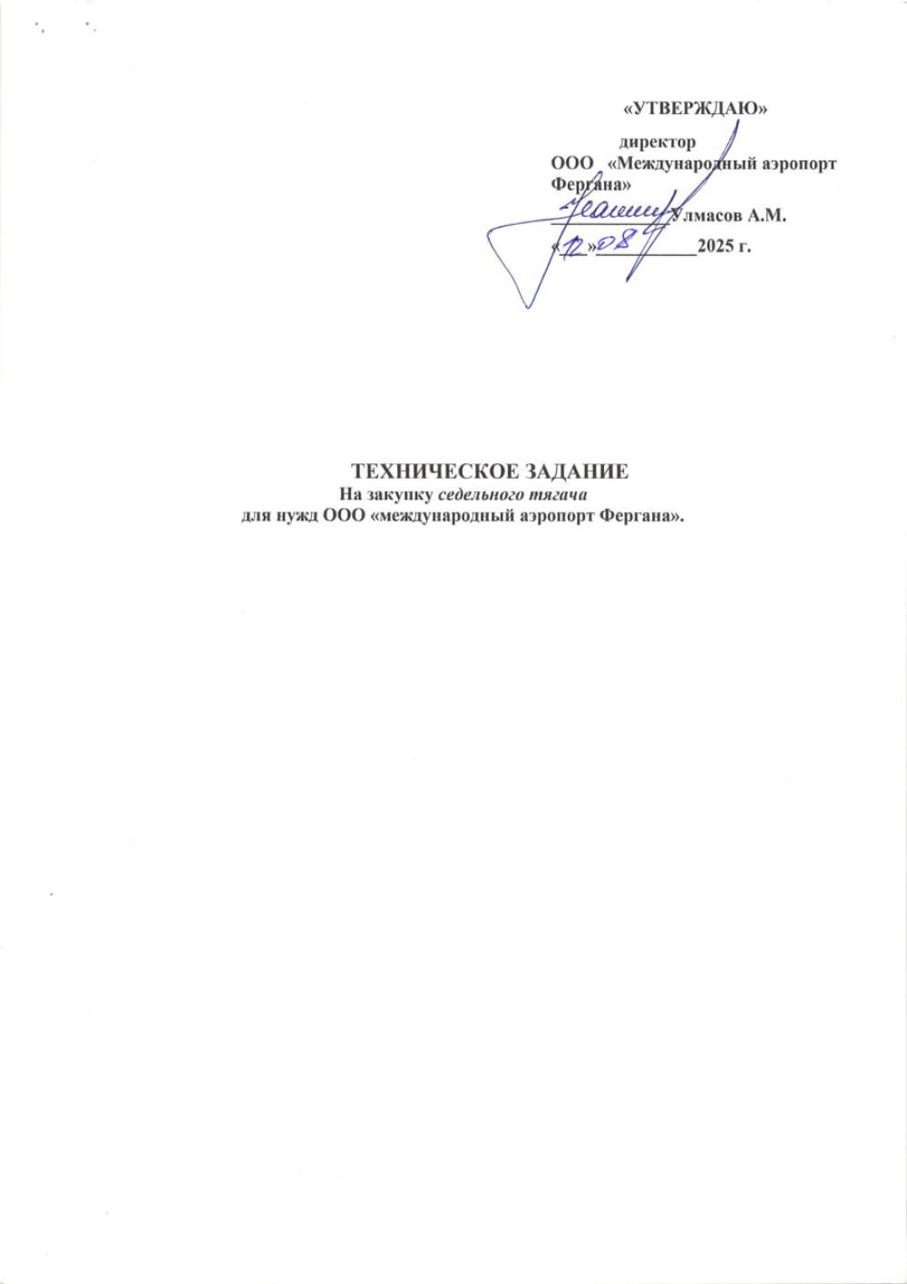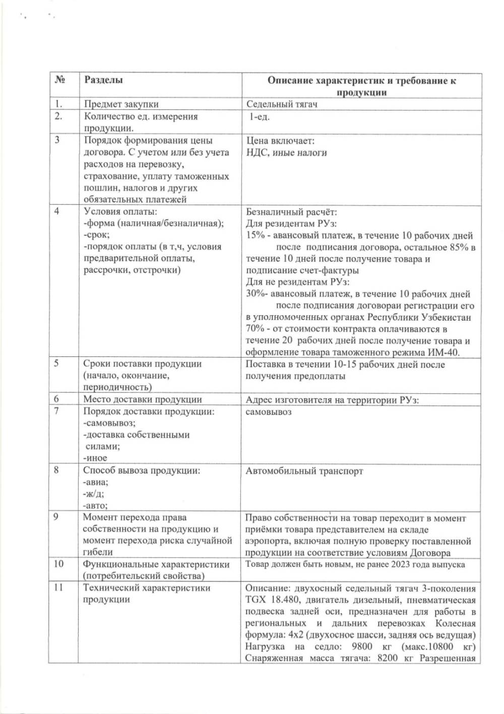 «Farg‘ona xalqaro aeroporti» MCHJ ehtiyoji uchun 1 dona maxsus transport (седельный тягач) vositasi etkazib berish bilan shug‘ullanuvchi barcha yetkazib beruvchilar o‘z takliflarini ”Farg‘ona xalqaro aeroporti” MCHJ ma‘muriyatiga taqdim etishlari mumkin. Taqdim etilgan takliflar ushbu tovarlarni xarid qilib olishda uning boshlang‘ich narxini aniqlashda foydalaniladi. Texnik topshiriq 4 varaqda ilova qilinadi. Murojat uchun manzil Farg‘ona shahar Aeroport ko‘cha 16 uy. Elekton manzil: info.feg@uzairports.com Mas’ul shaxs MTTG rahbari Oripov D.A. tel: 73 241 60 03. 99 727 11 68