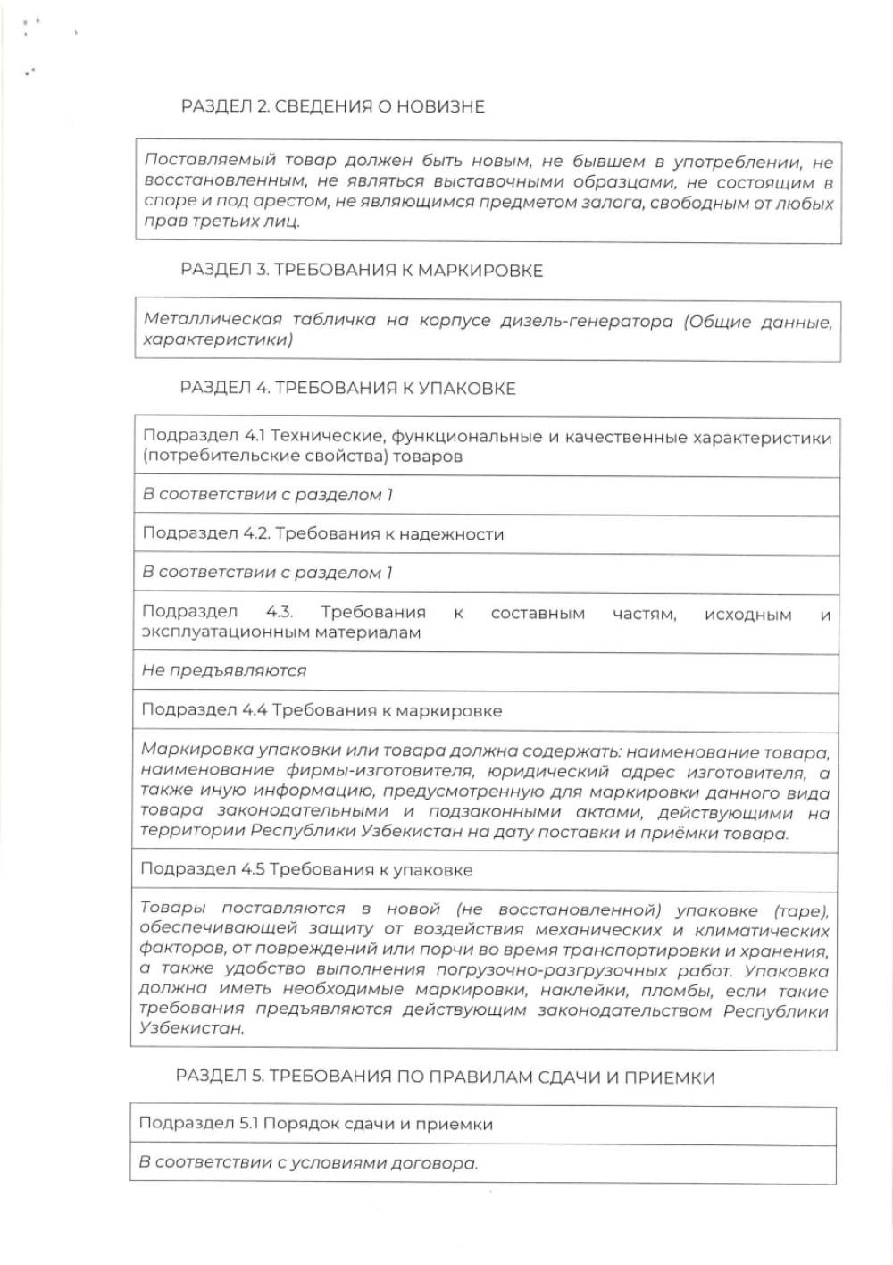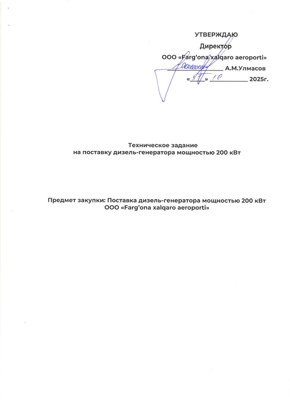 "Farg'ona xalqaro aeroporti" MCHJ extiyoji uchun 1 dona dizel generator uskunasini yetkazib berish faoliyati bilan shug‘ullanuvchi barcha yetkazib beruvchilar o‘z takliflarini Farg‘ona xalqaro aeroporti” MCHJ ma‘muriyatiga taqdim etishlari mumkin. Taqdim etilgan takliflar ushbu tovarni xarid qilib olishda uning boshlang‘ich narxini aniqlashda foydalaniladi. Texnik topshiriq 7 varaqda ilova qilinadi. Murojat uchun manzil Farg‘ona shahar Aeroport ko‘cha 16 uy. Elekton manzil: info.feg@uzairports.com Mas’ul shaxs Oripov D.A. tel: 73 241 60 03. 99 727 11 68