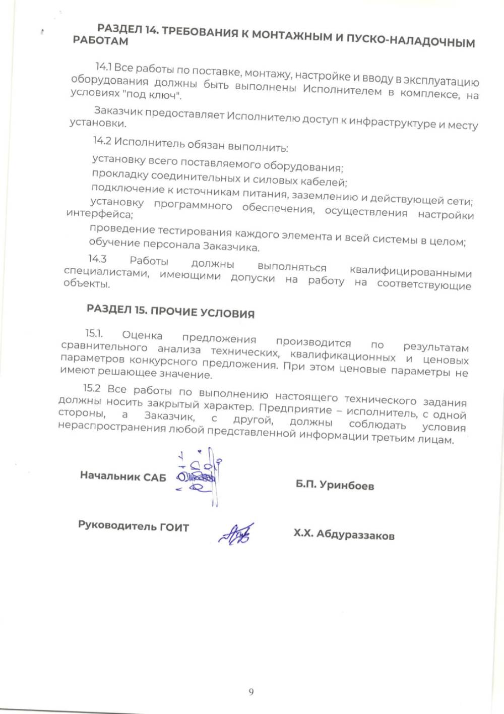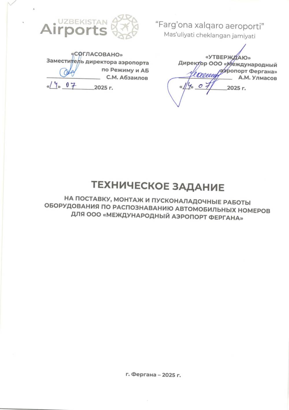 «Farg‘ona xalqaro aeroporti» MCHJ ga avtomobil raqamlarini aniqlash uchun uskunalarni o'rnatish va ishga tushirish xizmatini bajarish faoliyati bilan shug‘ullanuvchi barcha yetkazib beruvchilar o‘z takliflarini ”Farg‘ona xalqaro aeroporti” MCHJ ma‘muriyatiga taqdim etishlari mumkin. Taqdim etilgan takliflar ushbu xizmatni xarid qilib olishda uning boshlang‘ich narxini aniqlashda foydalaniladi Texnik topshiriq 9 varaqda ilova qilinadi. Murojat uchun manzil Farg‘ona shahar Aeroport ko‘cha 16 uy. Elekton manzil: info.feg@uzairports.com tel: 73 241 60 03. Mas’ul shaxs ATXKG raxbari Abdurazoqov X. Tel 998 91 651 89 55AXX boshlig‘i Urinboev B.P.