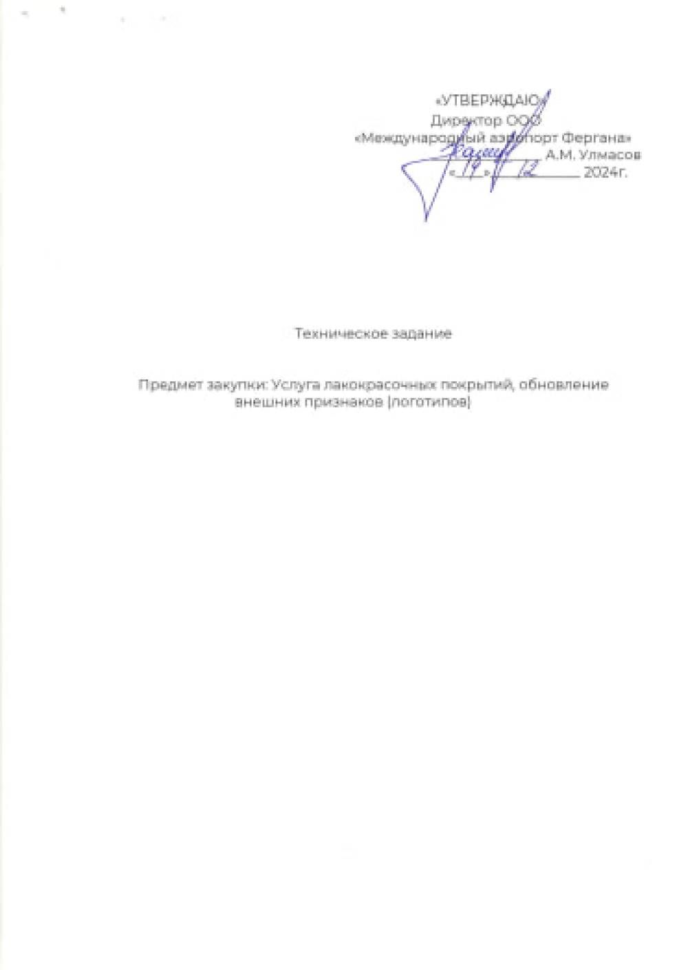 «Farg‘ona xalqaro aeroporti» MCHJ maxsus transport vositalarining tashqi belgilarini (logotiplarini) yangilash va bo'yoq qoplamasini yangilash xizmatini ko‘rsatish faoliyati bilan shug‘ullanuvchi barcha yetkazib beruvchilar o‘z takliflarini "Farg‘ona xalqaro aeroporti” MCHJ ma‘muriyatiga taqdim etishlari mumkin. Taqdim etilgan takliflar ushbu xizmatni xarid qilib olishda uning boshlang‘ich narxini aniqlashda foydalaniladi. texnik topshiriq 5 varaqda ilova qilinadi. Murojat uchun manzil Farg‘ona shahar Aeroport ko‘cha 16 uy. Elekton manzil: info.feg@uzairports.com Mas’ul shaxs bahodirov U tel: 73 241 60 03. 90 301 14 63
