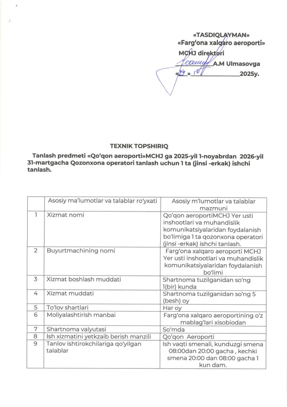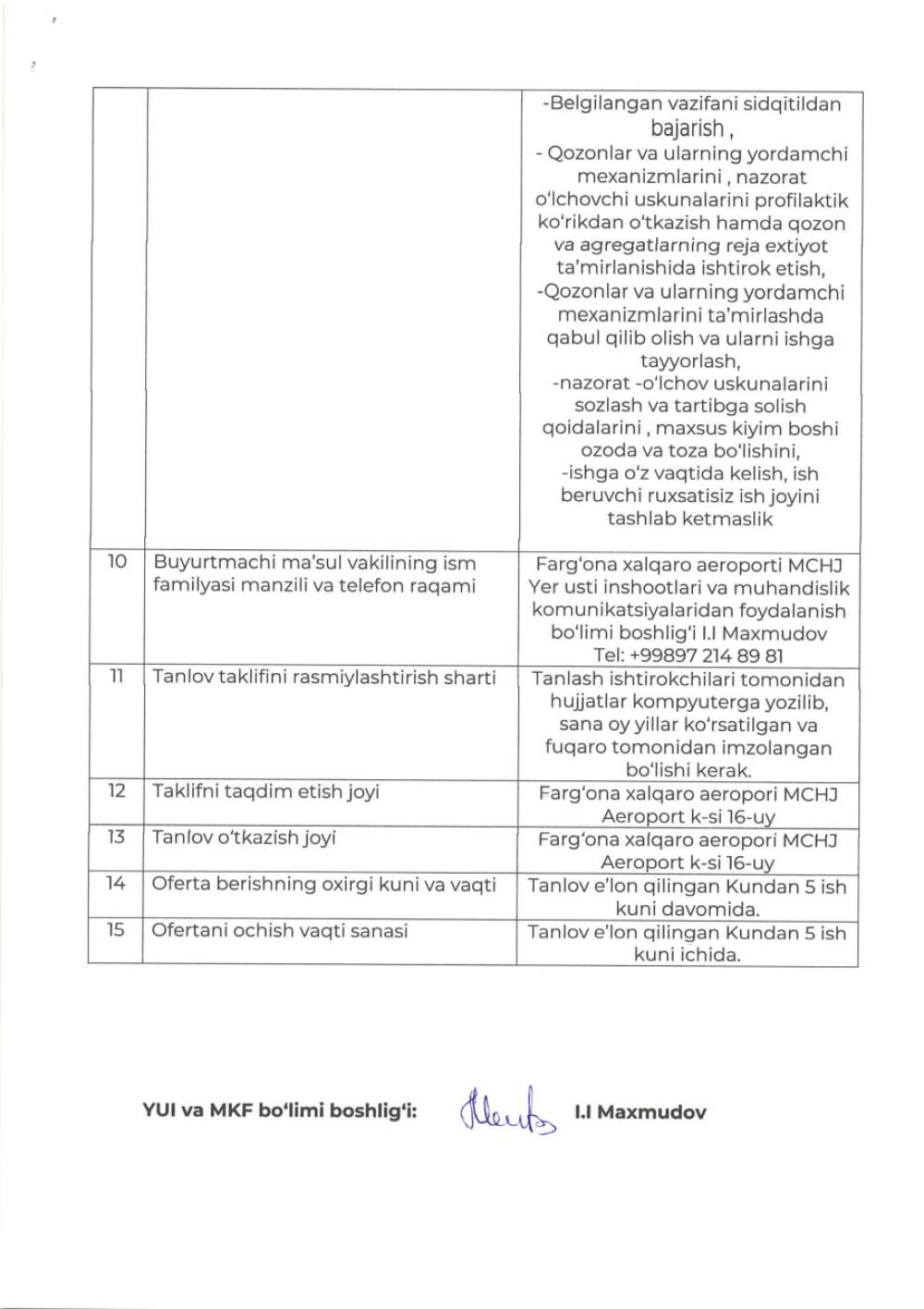 «Farg‘ona xalqaro aeroporti» MCHJ tarkibidagi Qo'qon aeroporti qozonxona operatori 1- ta (jinsi-erkak) ishchini mexnat kelishuvi asosida 5 oy muddat davomida bajarish bo'yicha barcha qiziquvchilar o‘z takliflarini Farg‘ona xalqaro aeroporti” MCHJ ma‘muriyatiga taqdim etishlari mumkin. Taqdim etilgan takliflar ushbu xizmatni xarid qilib olishda uning boshlang‘ich narxini aniqlashda foydalaniladi Texnik topshiriq 2 varaqda ilova qilinadi. Murojat uchun manzil Farg‘ona shahar Aeroport ko‘cha 16 uy. Elekton manzil: info.feg@uzairports.com tel: 73 241 60 03. Mas’ul Maxmudov I 97 214 89 81