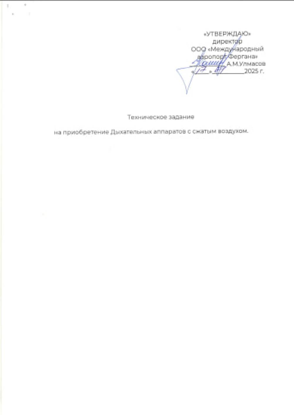 «Farg‘ona xalqaro aeroporti» MCHJ yong‘in xavfsizligi xizmatida foydalanish uchun zarur bo‘lgan nafas olish apparati va havo kompressori uskunalarini yetkazib berish faoliyati bilan shug‘ullanuvchi barcha yetkazib beruvchilar o‘z takliflarini "Farg‘ona xalqaro aeroporti” MCHJ ma‘muriyatiga taqdim etishlari mumkin. Taqdim etilgan takliflar ushbu uskunalarni xarid qilib olishda uning boshlang‘ich narxini aniqlashda foydalaniladi. texnik topshiriq 10 varaqda ilova qilinadi. Murojat uchun manzil Farg‘ona shahar Aeroport ko‘cha 16 uy. Elekton manzil: info.feg@uzairports.com Mas’ul shaxs Shamsutdinov X.A. tel: 73 241 60 03. 90 277 55 40