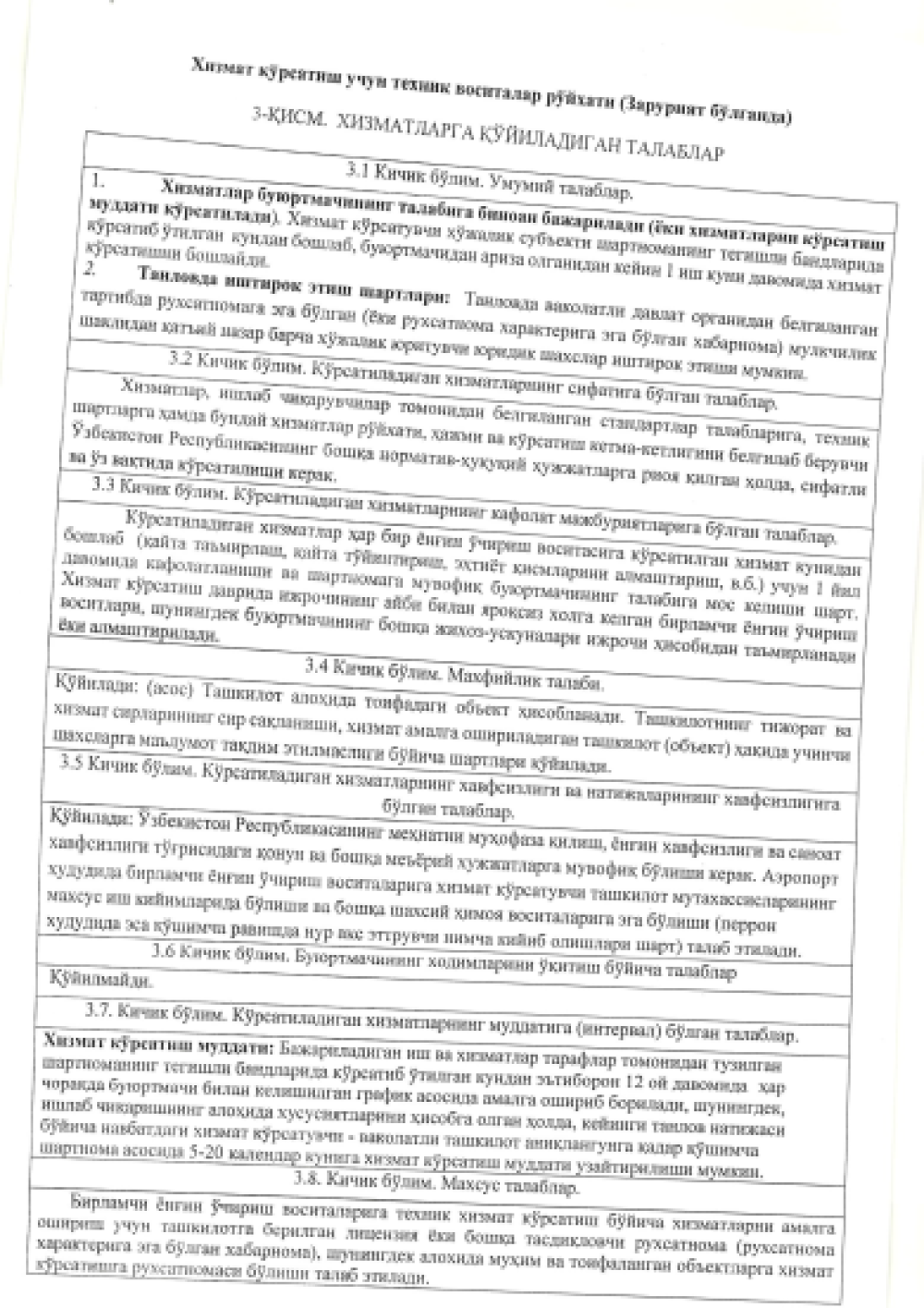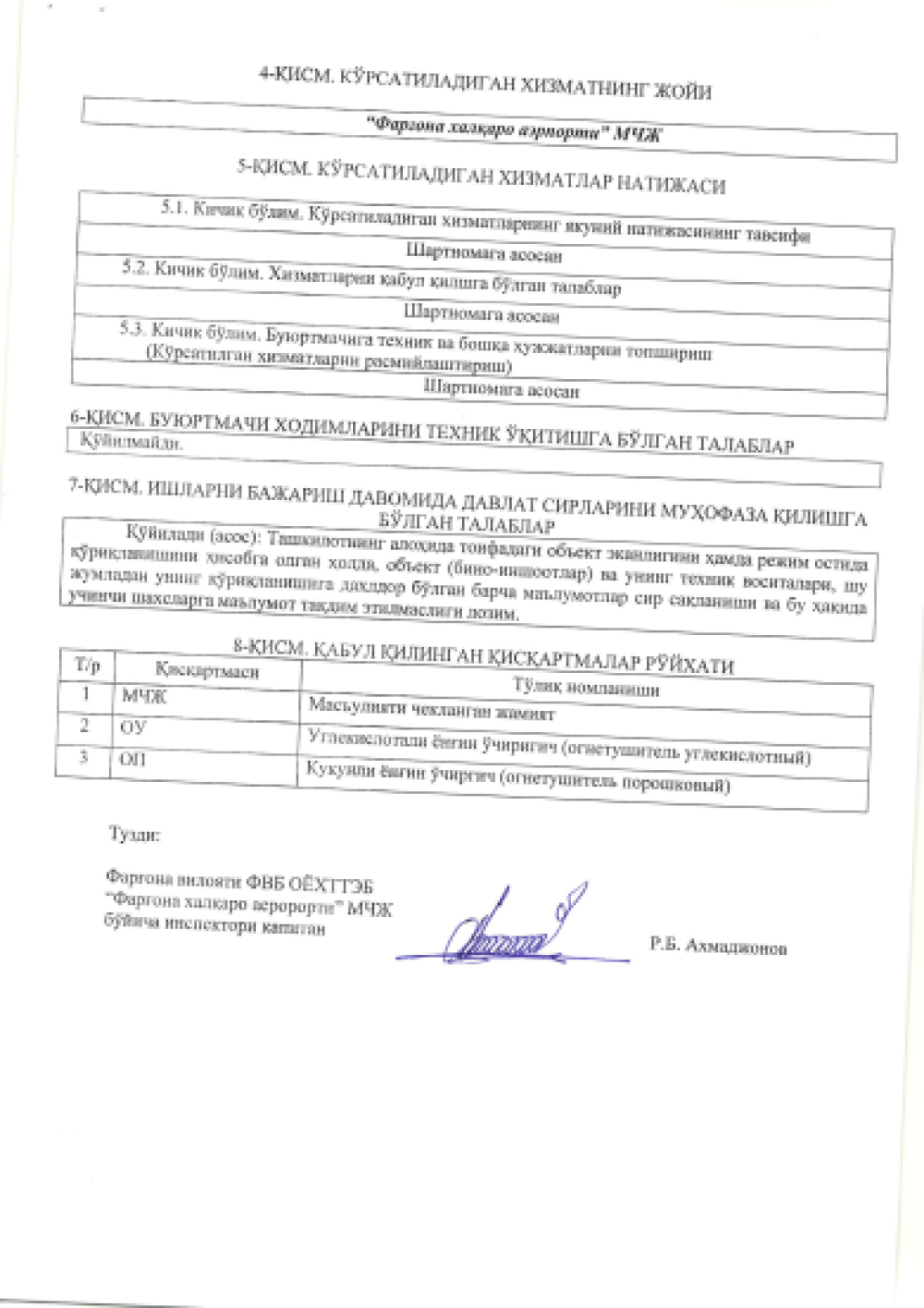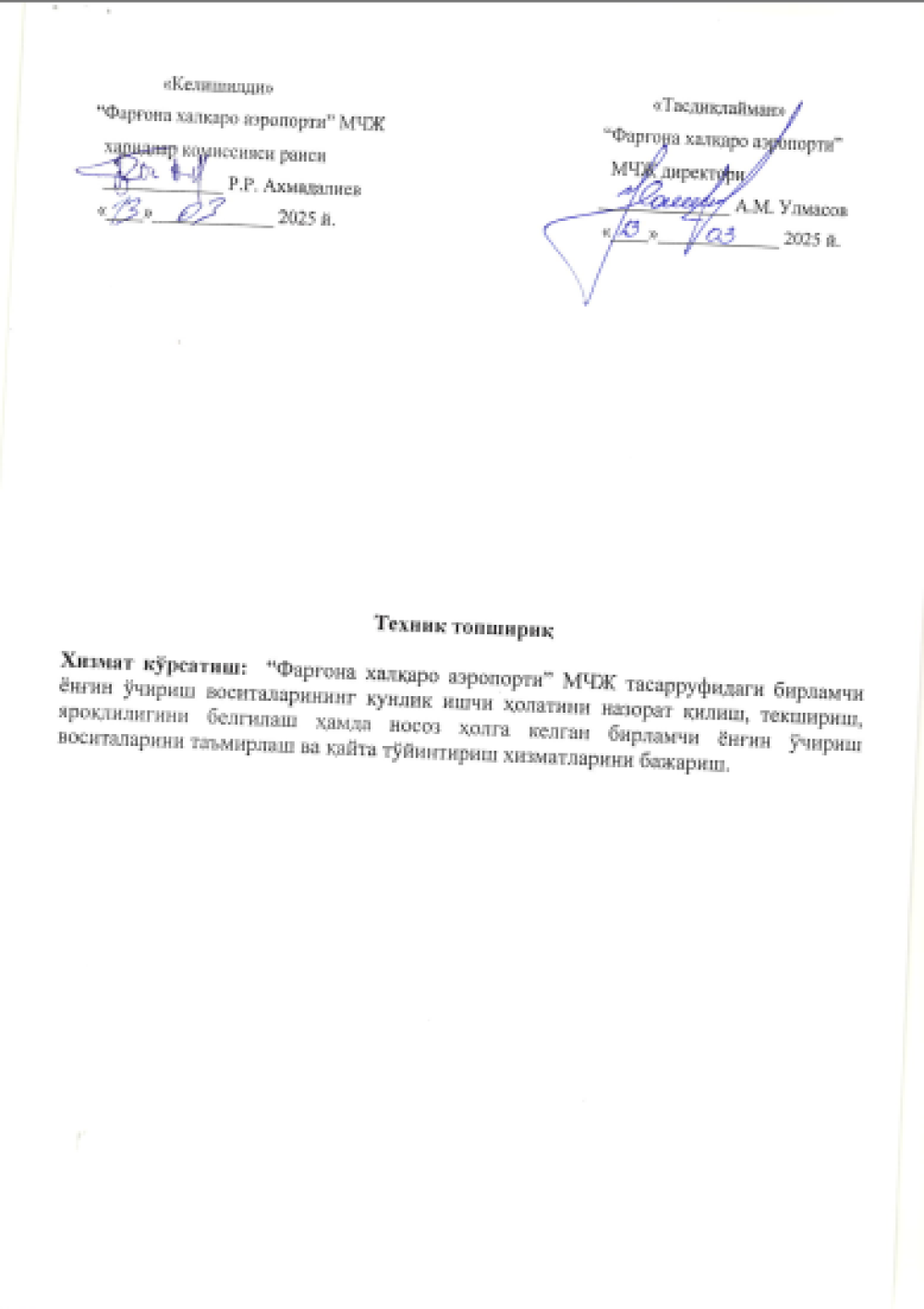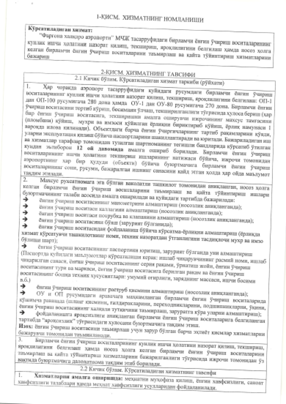 «Farg‘ona xalqaro aeroporti» MCHJning birlamchi yong‘in o‘chirish vositalariga texnik xizmat ko‘rsatish va qayta zaryadlash, sozlash kabi xizmatlarni ko‘rsatish bilan shug‘ullanuvchi barcha yetkazib beruvchilar o‘z takliflarini ”Farg‘ona xalqaro aeroporti” MCHJ ma‘muriyatiga taqdim etishlari mumkin. Taqdim etilgan takliflar ushbu xizmatni xarid qilib olishda uning boshlang‘ich narxini aniqlashda foydalaniladi. Texnik topshiriq 5 varaqda ilova qilinadi. Murojat uchun manzil Farg‘ona shahar Aeroport ko‘cha 16 uy. Elekton manzil: info.feg@uzairports.com Mas’ul shaxs AXX boshlig’i Urinboyev B.P. tel: 73 241 60 03. 91 679 58 20.