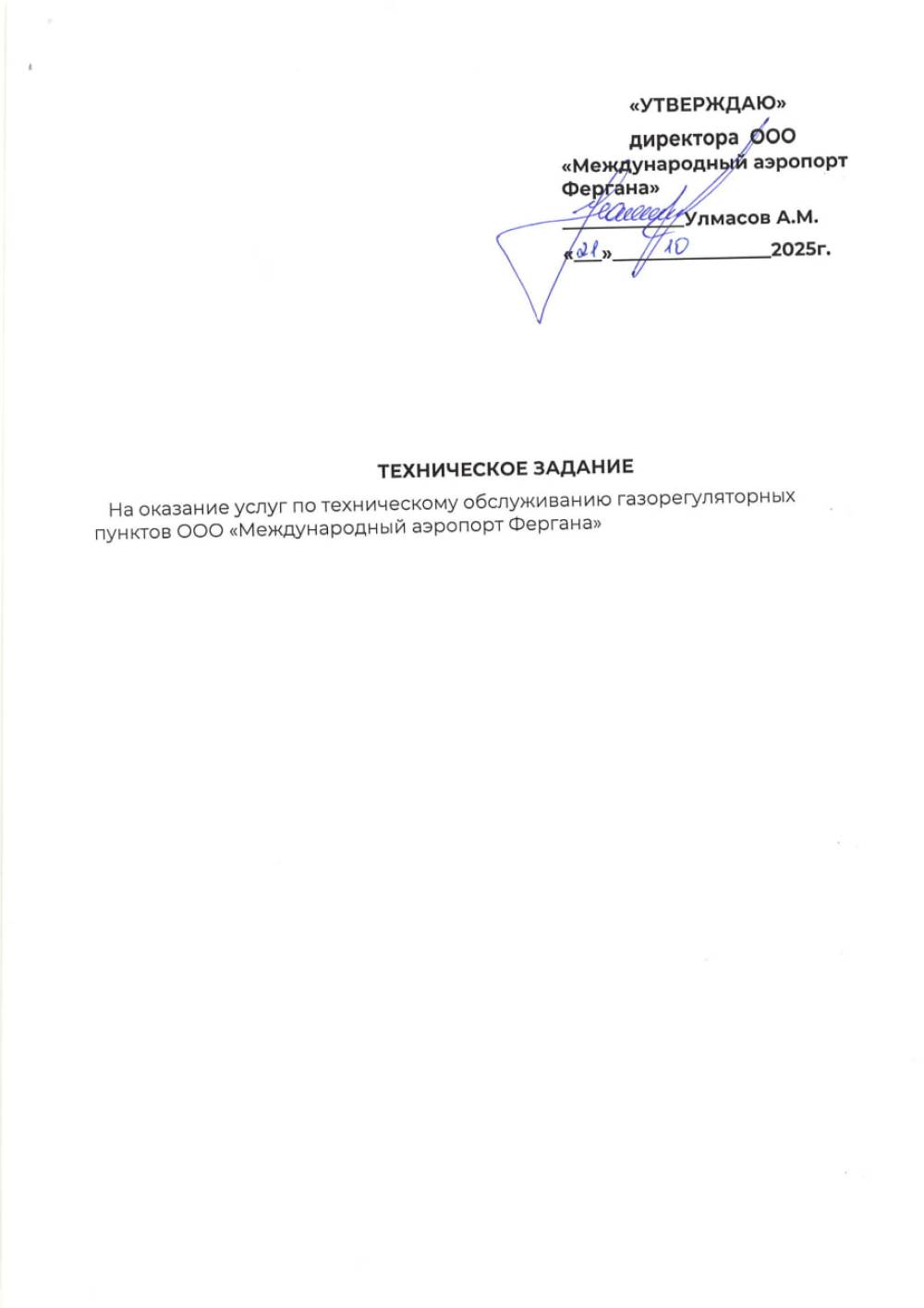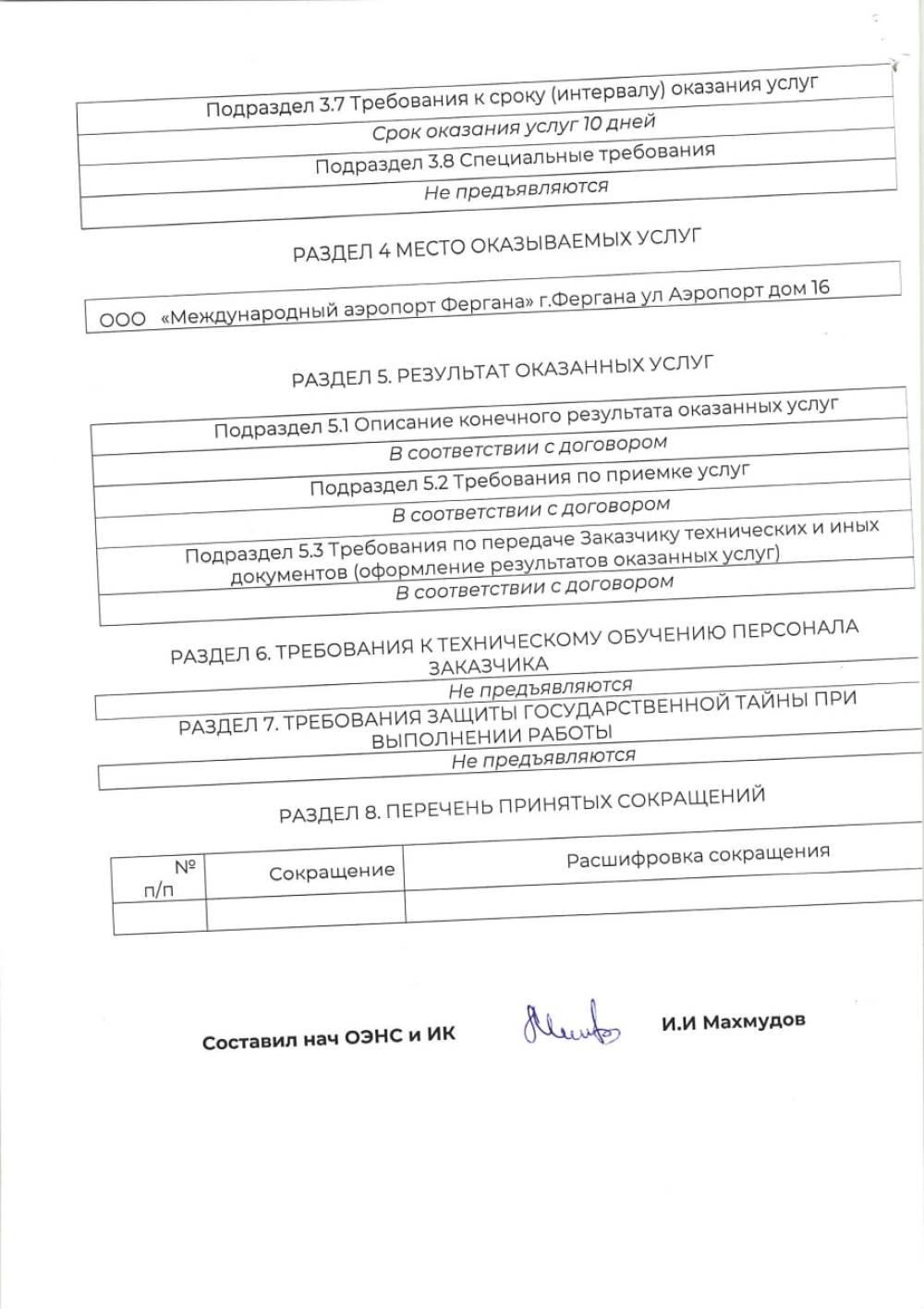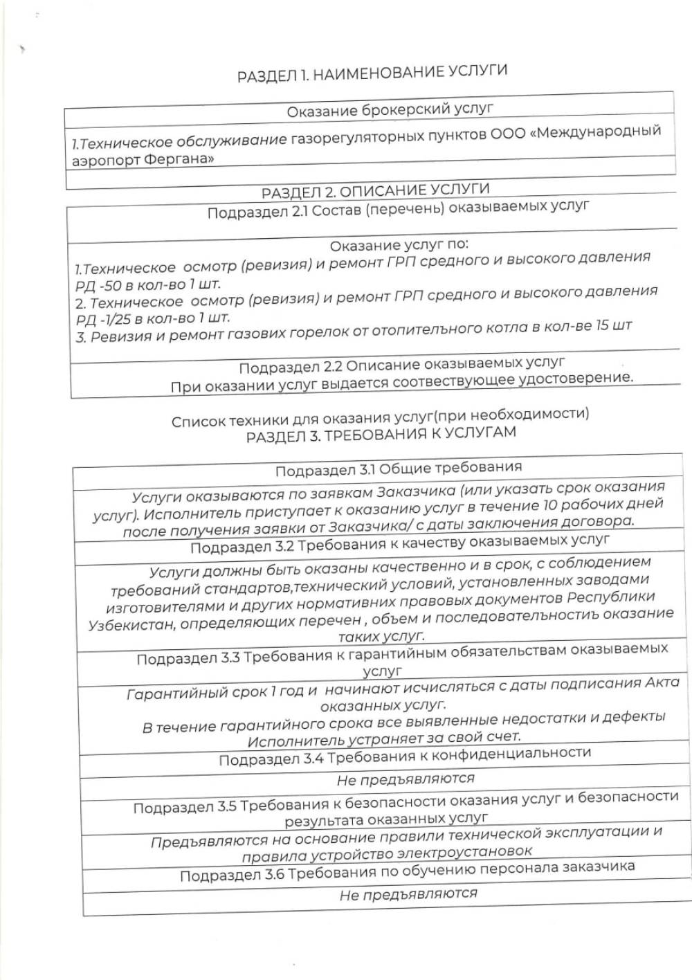 «Farg‘ona xalqaro aeroporti» MCHJning gazni boshqarish punktlariga texnik xizmat ko'rsatish xizmatini bajarish bo'yicha barcha qiziquvchilar o‘z takliflarini Farg‘ona xalqaro aeroporti” MCHJ ma‘muriyatiga taqdim etishlari mumkin. Taqdim etilgan takliflar ushbu xizmatni xarid qilib olishda uning boshlang‘ich narxini aniqlashda foydalaniladi Texnik topshiriq 4 varaqda ilova qilinadi. Murojat uchun manzil Farg‘ona shahar Aeroport ko‘cha 16 uy. Elekton manzil: info.feg@uzairports.com tel: 73 241 60 03. Mas’ul Maxmudov I.I.Tel 998 97 214 89 81