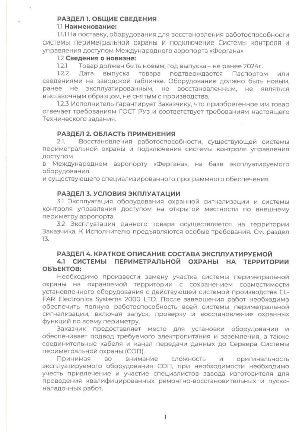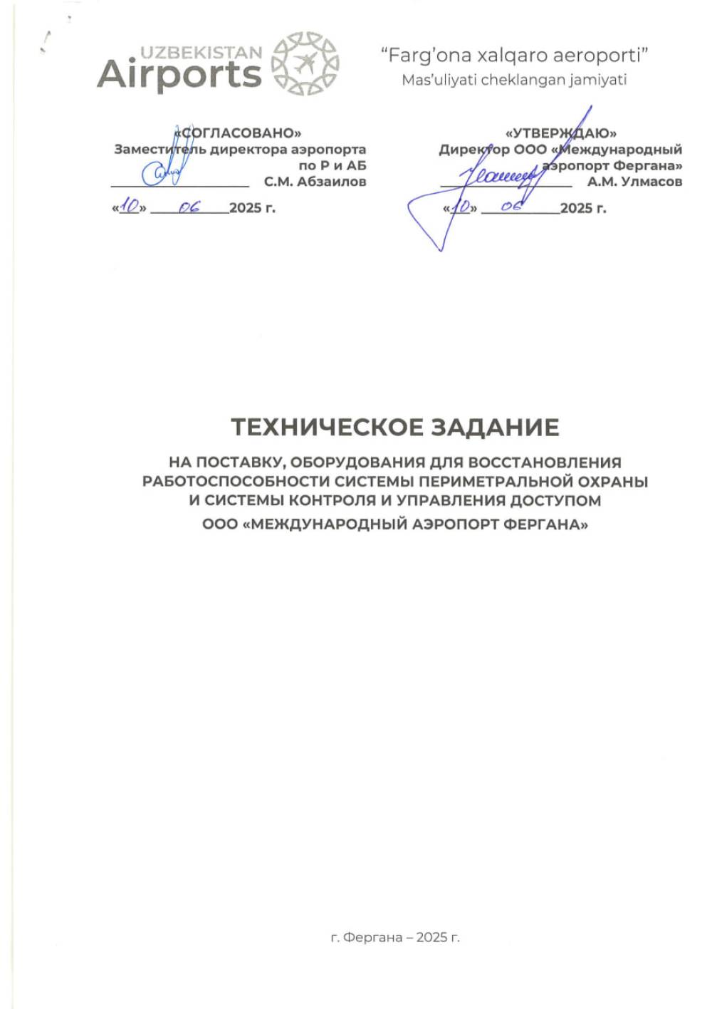 «Farg‘ona xalqaro aeroporti» MCHJning perimetrni muhofaza qilish tizimi va kirishni boshqarish va boshqarish tizimining ishlashini tiklash uchun uskunalarni etkazib o‘rnatib berish bilan shug‘ullanuvchi barcha yetkazib beruvchilar o‘z takliflarini "Farg‘ona xalqaro aeroporti” MCHJ ma‘muriyatiga taqdim etishlari mumkin. Taqdim etilgan takliflar ushbu tovarlarni xarid qilib olishda uning boshlang‘ich narxini aniqlashda foydalaniladi. Texnik topshiriq 11 varaqda ilova qilinadi. Murojat uchun manzil Farg‘ona shahar Aeroport ko‘cha 16 uy. Elekton manzil: info.feg@uzairports.com Mas’ul shaxs AX boshlig’i o‘rinbosari Madraximov M.M. tel: 73 241 60 03. +998 90 715 00 65 . Таkliflar17 .06.2025 yil 17:00 gacha taqdim etilishi mumkin