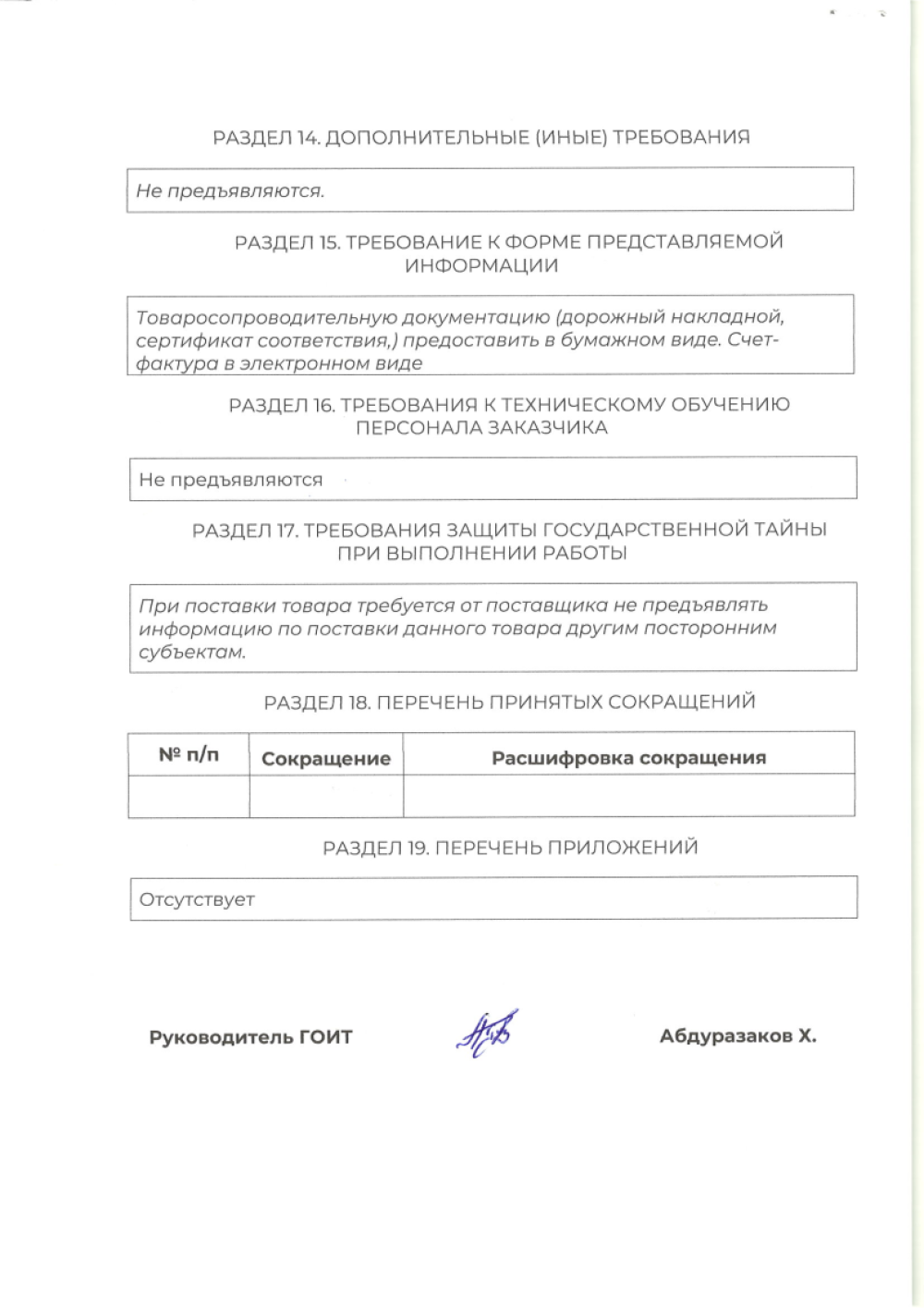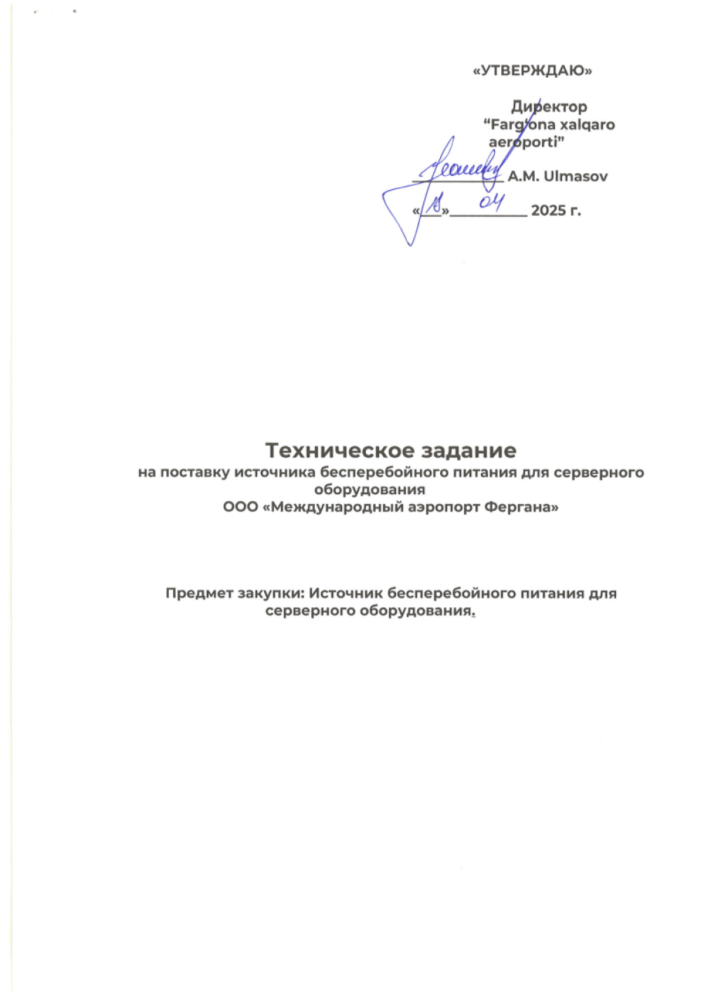 «Farg‘ona xalqaro aeroporti» MCHJning server uskunalari uchun uzluksiz quvvat manbai etkazib berish bilan shug‘ullanuvchi barcha yetkazib beruvchilar o‘z takliflarini "Farg‘ona xalqaro aeroporti” MCHJ ma‘muriyatiga taqdim etishlari mumkin. Taqdim etilgan takliflar ushbu tovarlarni xarid qilib olishda uning boshlang‘ich narxini aniqlashda foydalaniladi. Texnik topshiriq 8 varaqda ilova qilinadi. Murojat uchun manzil Farg‘ona shahar Aeroport ko‘cha 16 uy. Elekton manzil: info.feg@uzairports.com Mas’ul shaxs ATXKG boshlig’i Abdurazakov X. tel: 73 241 60 03. 91 651 89 55.