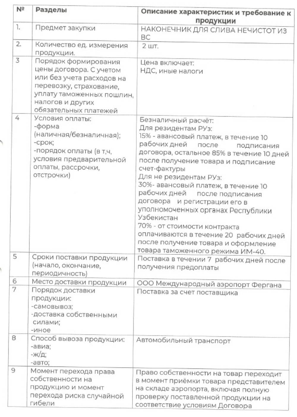 “Farg‘ona xalqaro aeroporti” MCHJ ehtiyoji uchun zarur bo‘lgan xavo kemalariga xizmat ko'rsatishda foydalaniladigan maxsus texnika vositasi uchun chiqindilarni to'kish uchun nozul (наконечник) maxsulotini yetkazib berish bo‘yicha barcha qiziquvchilar ma'lumot sifatida o'z takliflarini taqdim etishlari mumkin. Ushbu berilgan takliflar bugungi kunda bu maxsulotlni belgilangan tartibda davlat xaridlari to'g'risidagi qonunga muvofiq birja savdolari orqali e'lon berilib tanlov o'tkazilishida uning boshlang'ich narxini aniqlashda foydalaniladi va taklif berish muddati 02.10.2024yil gacha.