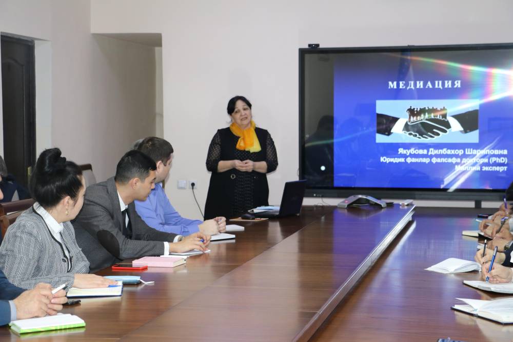 Tadbirga taklif etilgan Yuridik fanlar bo‘yicha falsafa doktori (PhD) Milliy ekspert Dilbaxor Yakubova mediatsiyaning kelib chiqishi, maqsadi, prinsiplari, afzalliklari va roliga bag‘ishlangan ma’ruzasi bilan ishtirok etdi.