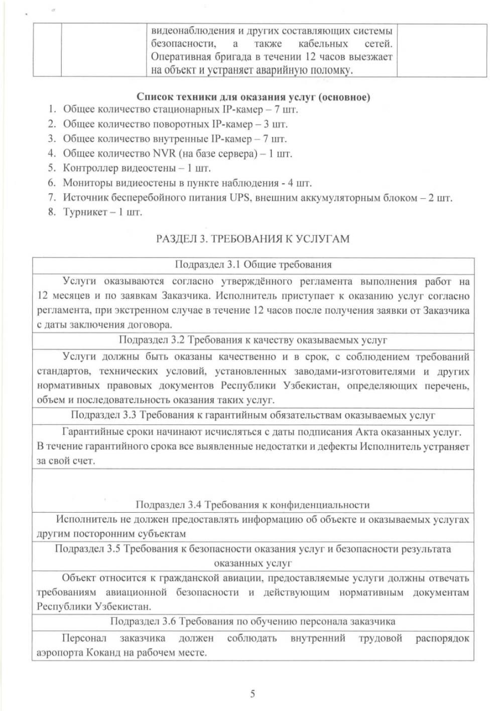 Qo'qon aeroporti videokuzatuv tizimiga texnik xizmat ko 'rsatish va rejali-profilaktik ta' mirlash xizmatini bajarish faoliyati bilan shug‘ullanuvchi barcha yetkazib beruvchilar o‘z takliflarini Farg‘ona xalqaro aeroporti” MCHJ ma‘muriyatiga taqdim etishlari mumkin. Taqdim etilgan takliflar ushbu xizmatni xarid qilib olishda uning boshlang‘ich narxini aniqlashda foydalaniladi Texnik topshiriq 8 varaqda ilova qilinadi. Murojat uchun manzil Farg‘ona shahar Aeroport ko‘cha 16 uy. Elekton manzil: info.feg@uzairports.com tel: 73 241 60 03. Mas’ul shaxs ATXKG raxbari Abdurazoqov X. Tel 998 91 651 89 55