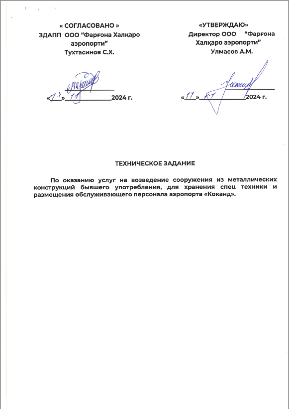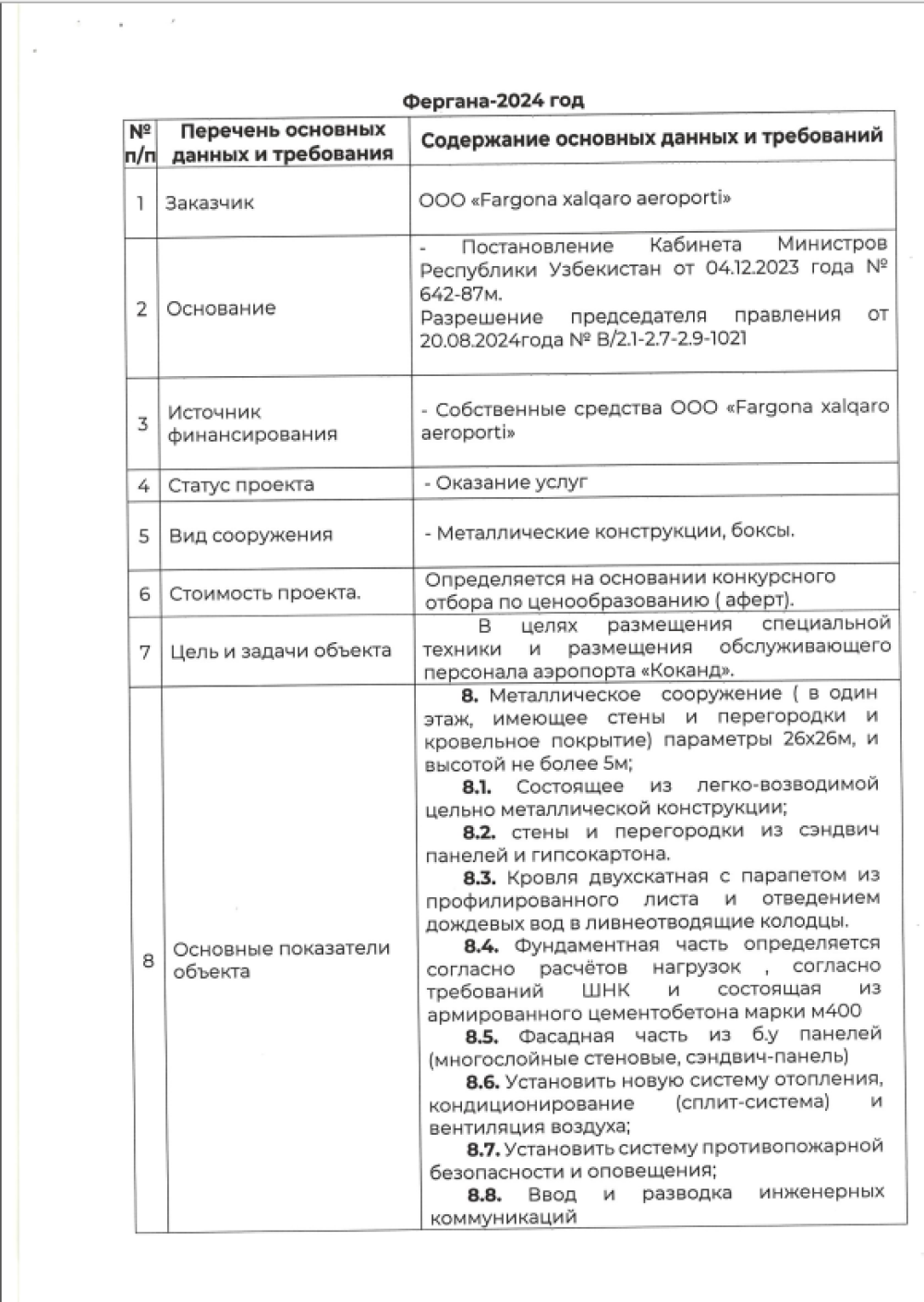 Qoqon aeroportida maxsus jihozlarni saqlash va xizmat ko‘rsatuvchi xodimlarni joylashtirish uchun foydalanilgan metall konstruksiyalardan konstruksiya qurish xizmatini ko‘rsatish faoliyati bilan shug‘ullanuvchi barcha yetkazib beruvchilar o‘z takliflarini Farg‘ona xalqaro aeroporti” MCHJ ma‘muriyatiga taqdim etishlari mumkin. Taqdim etilgan takliflar ushbu xizmatni xarid qilib olishda uning boshlang‘ich narxini aniqlashda foydalaniladi. texnik topshiriq 4 varaqda ilova qilinadi. Murojat uchun manzil Farg‘ona shahar Aeroport ko‘cha 16 uy. Elekton manzil: info.feg@uzairports.com Mas’ul shaxs Maxmudov I.I tel: 73 241 60 03. 97 214 89 81